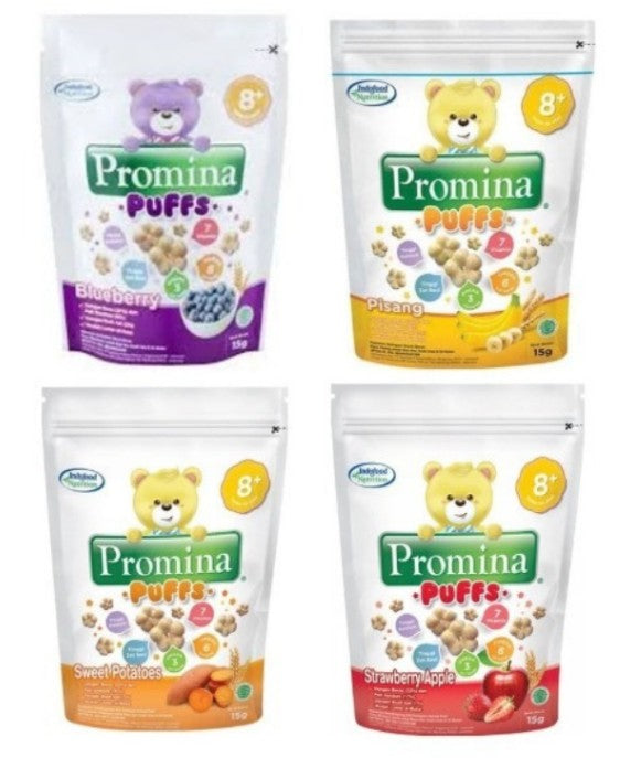 Promina Puffs is a snack food for babies specially formulated for ages 8 months and over. Made from selected ingredients such as rice, wheat and real fruit. This snack is not only delicious but also high in calcium, iron, omega 3 & 6, and enriched with 7 vitamins which are good for growth. As for the texture itself, you don't need to worry because this snack melts in your mouth.